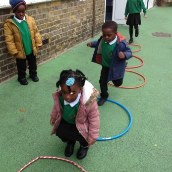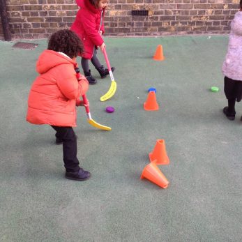 The children in Nursery have been enjoying taking part in physical activities in the outdoor area. They have been practising their aim by throwing beanbags into nets, exploring different ways of jumping by crossing the hoop ‘bridge’, and taking part in team games using our new hockey equipment. We set a new physical challenge for the children every week.