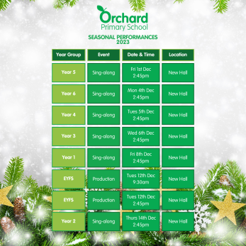 Dear Parents/Carers, you have been invited to attend our annual seasonal performance. Please make a note of the date and time for your child’s year group. We look forward to welcoming you!