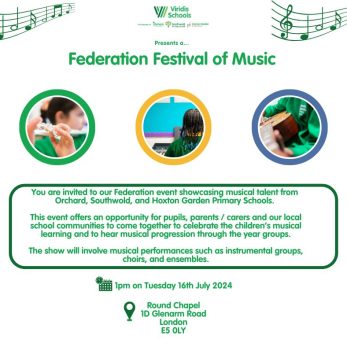 We are delighted to invite all parents and families of Orchard Primary to join us at the Federation’s Music Festival tomorrow, Tuesday 16th July at 1:00pm at the Round Chapel to celebrate music, community, and joy! Further details down below.