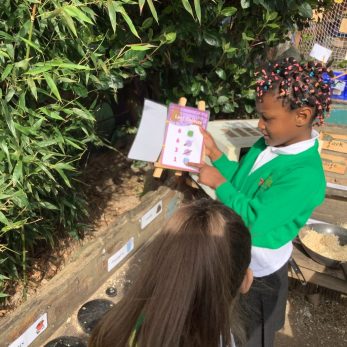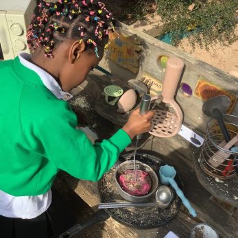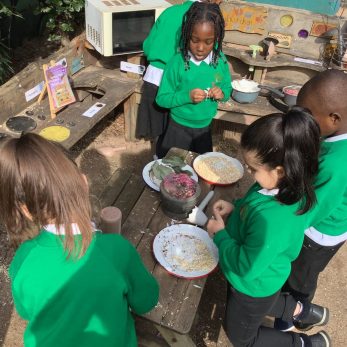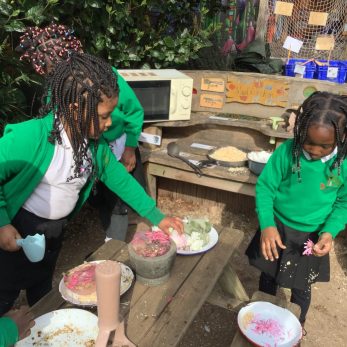 EYFS have been busy preparing a Easter picnic in their mud kitchen. They picked petals and sprinkled them on top of their hot cross buns and used different tools to crush frozen flower ice blocks to make desserts.