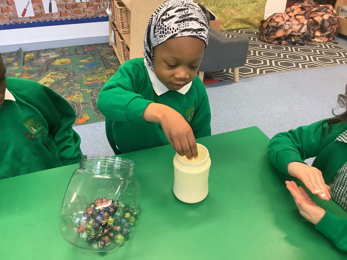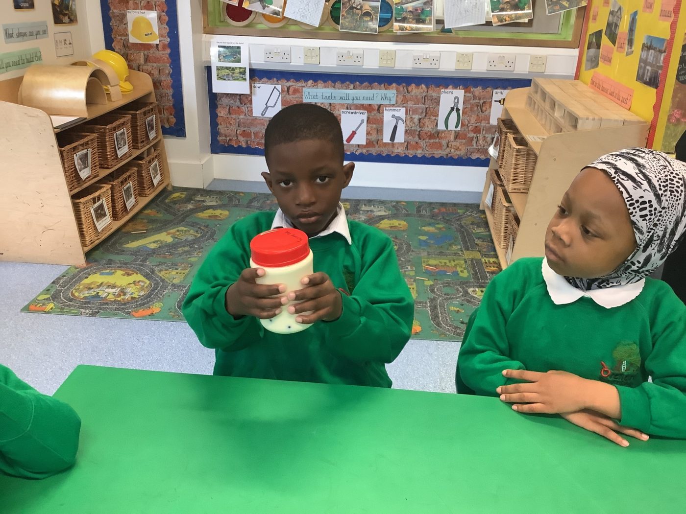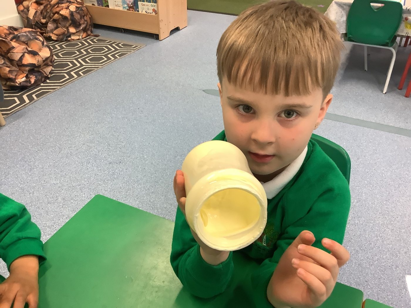 EYFS became farmers, producing their own butter! They poured cream into jars and added marbles, and shook all the ingredients together. They then wrote down their homemade butter recipe.
