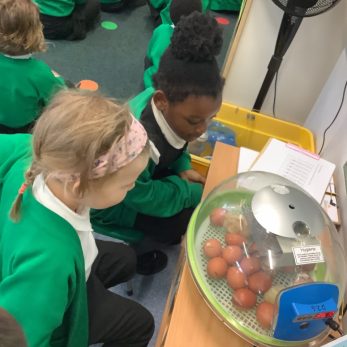EYFS enjoyed eye witnessing the process of eggs hatching. They are excited to take care and feed the little chicks before they go back to the farm this week.