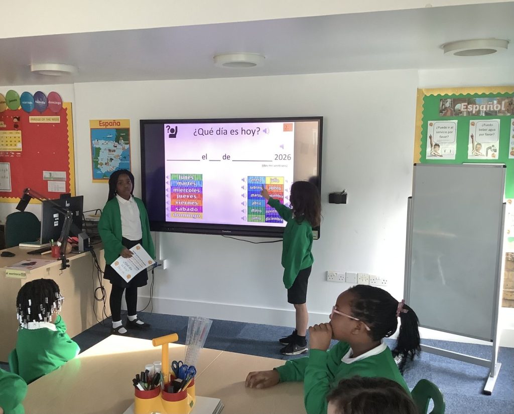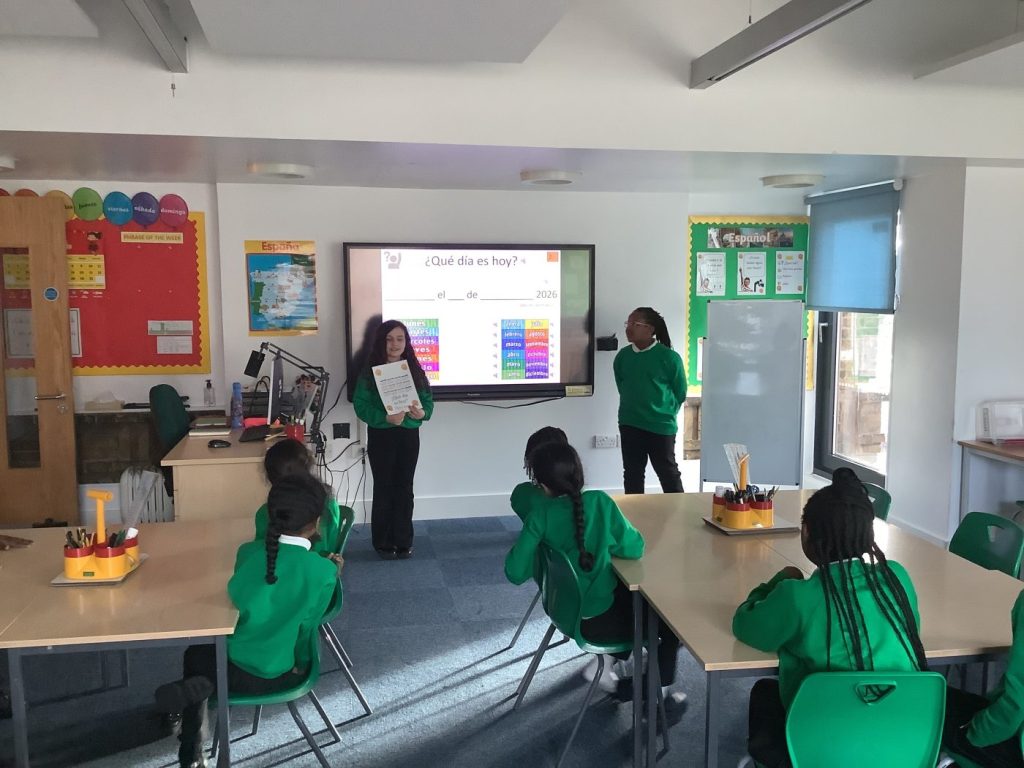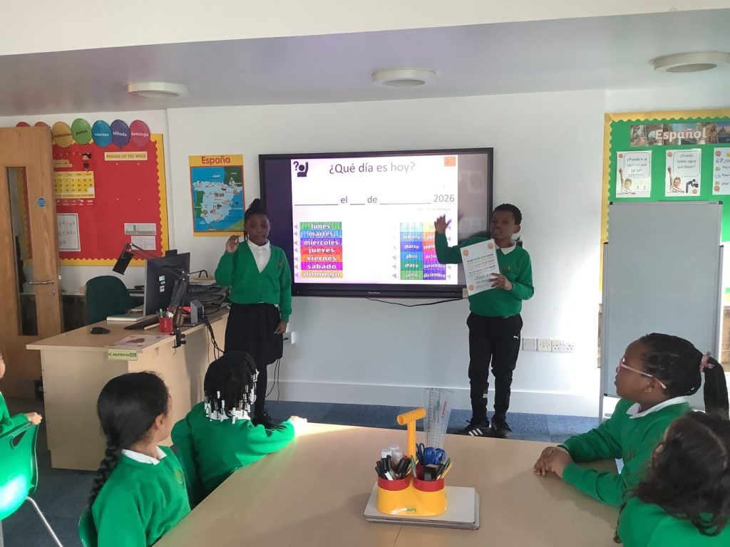 Year 3 and 4 Language Ambassadors met this week to rehearse presenting and sharing the phrase of the week with their classes. This term, our language ambassadors are supporting their peers to ask ‘Qué día es hoy?’ (What day is it today?) and respond with the date in Spanish. This requires pupils to be role models for the language and pronunciation, encouraging their classmates to share what they know and build confidence in their speaking skills. Pupils were enthusiastic and used Spanish instructions – ‘escucha’ (listen), ‘levanta la mano’ (put your hand up), ‘repite, por favor’ (repeat, please) to ensure pupils knew what to do and joined in! Muy bien, chicos!