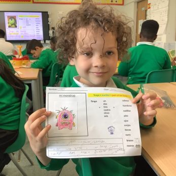 In MFL, Year 2 have been learning to name the body parts in Spanish. They perfected the Spanish version of ‘Head, Shoulders’ Knees and Toes’ and also confidently used the words in simple sentences, e.g. tengo dos manos. (I have two hands). They designed their own monsters and described them using their prior knowledge of numbers coupled with their new learning on body parts. They were incredibly proud of their work. ¡Fantástico!