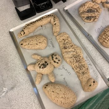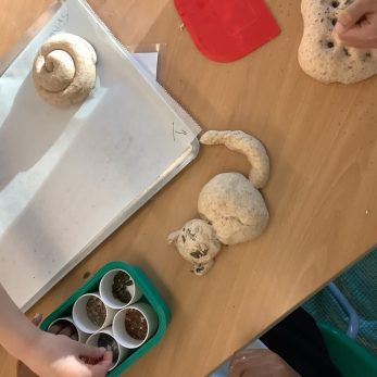 The children had to work carefully as a team to ensure everything was measured correctly. Then things got messy as all the children helped to mix and knead the dough. After the dough had risen the children got creative, shaping and decorating their individual bread buns ready for the oven.