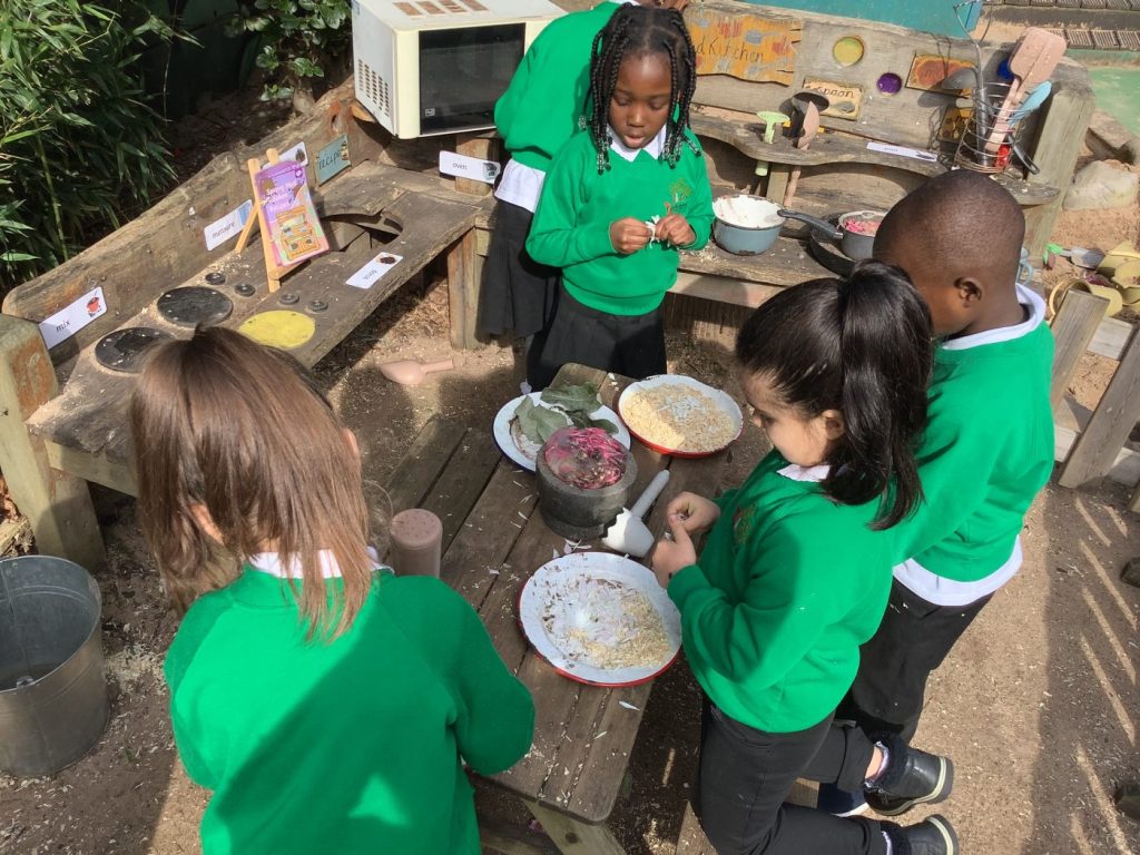 EYFS have been busy preparing a Easter picnic in their mud kitchen. They picked petals and sprinkled them on top of their hot cross buns and used different tools to…