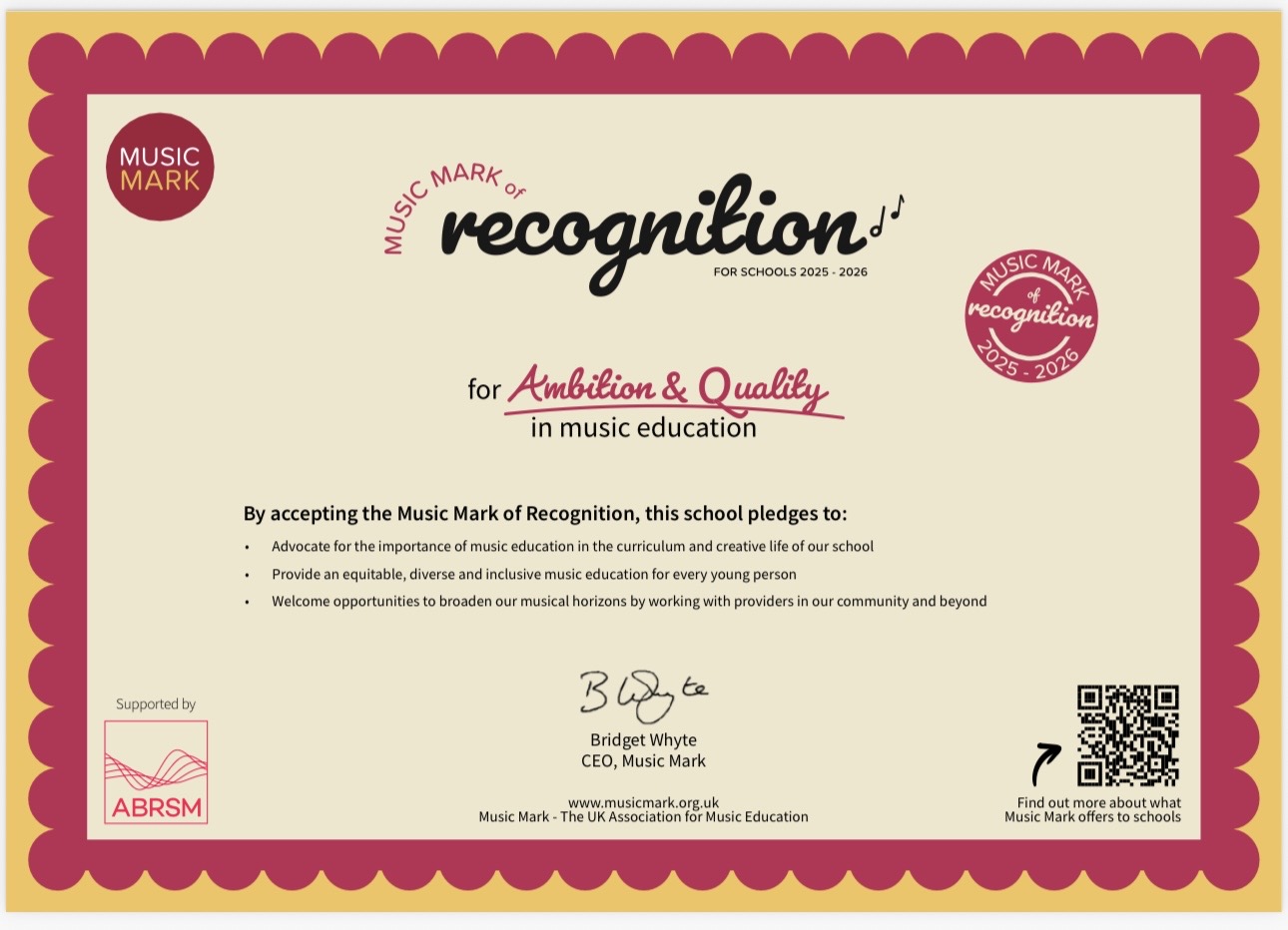 In recognition of the teaching and learning of music at Orchard, our school has been awarded the Music Mark of Recognition for Ambition & Quality. This award is in recognition of the high standard of music teaching at our school. It celebrates the value we have placed on music education, providing a diverse and inclusive curriculum which broadens the horizons of every child.